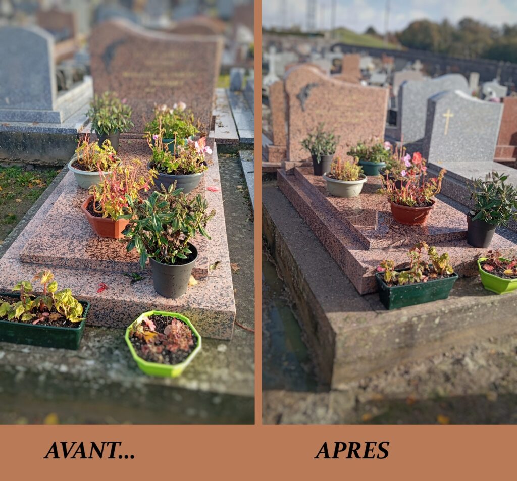 – nettoyage des surfaces (stèle, tombale, contours)